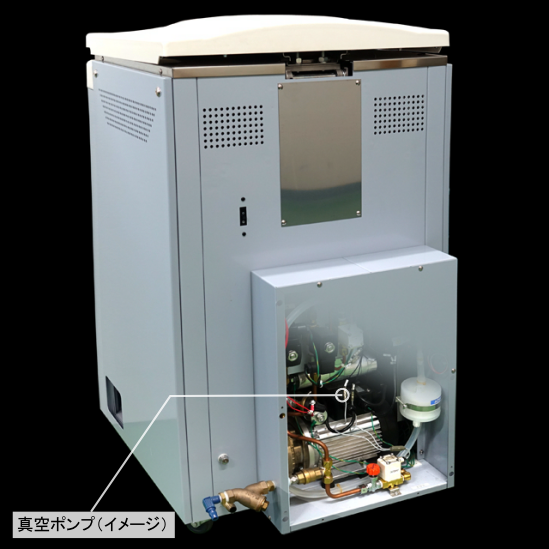 本器は真空ポンプによる空気抜方法(予備真空空気抜方式)を採用しております。真空ポンプによる脱気⇒蒸気を満たし加圧⇒再び脱気というサイクルを繰り返すことで残留空気を強力に排出します。
